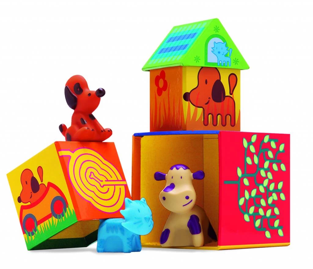 - Materiaal: stapelblokken gelamineerd karton, dieren rubber