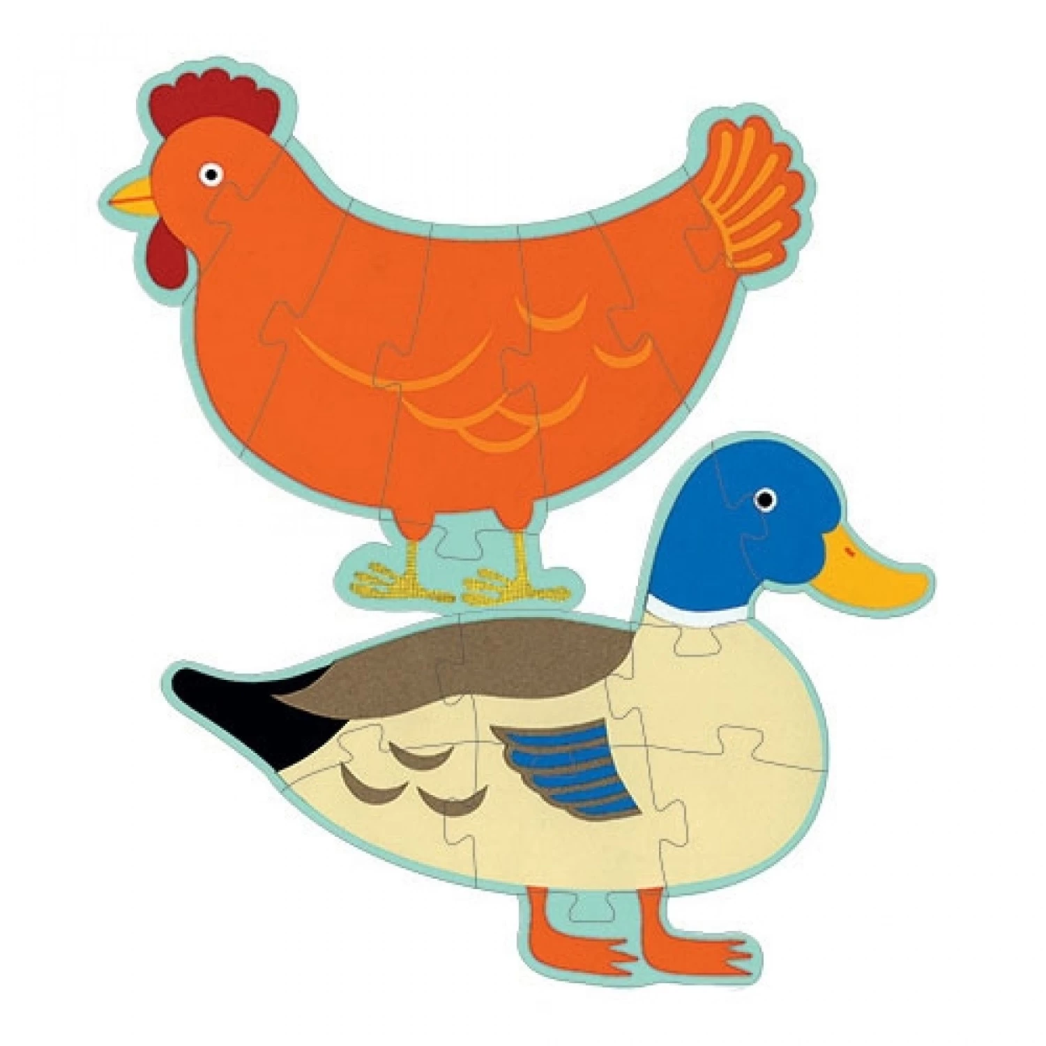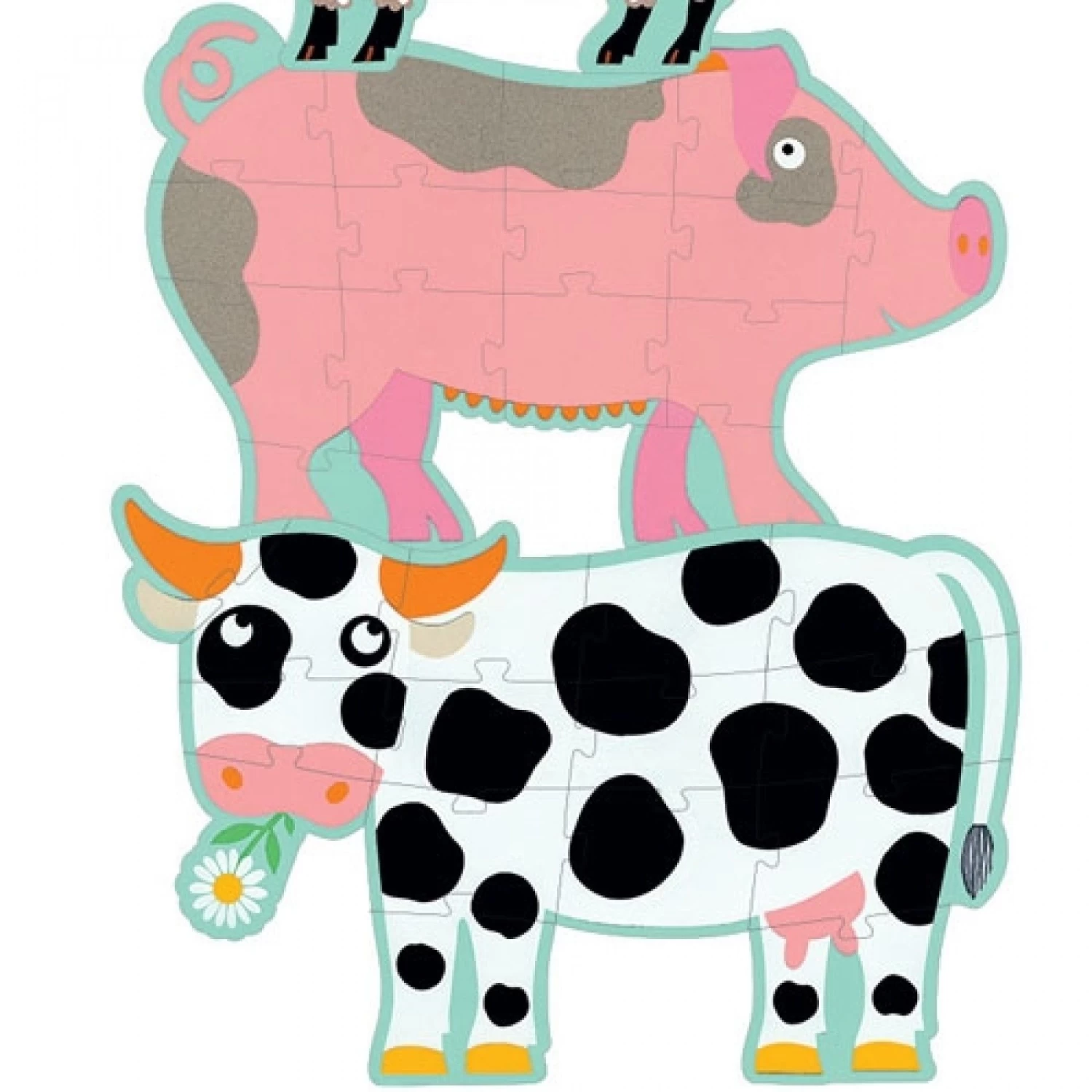 De koe en het varken zijn beide 15 stukjes, de hond en het schaap 12 en tot slot de kip en de eend met ieder 9 stukjes. Schuif alle dieren bovenop elkaar en je puzzel is wel 1.40 lang!