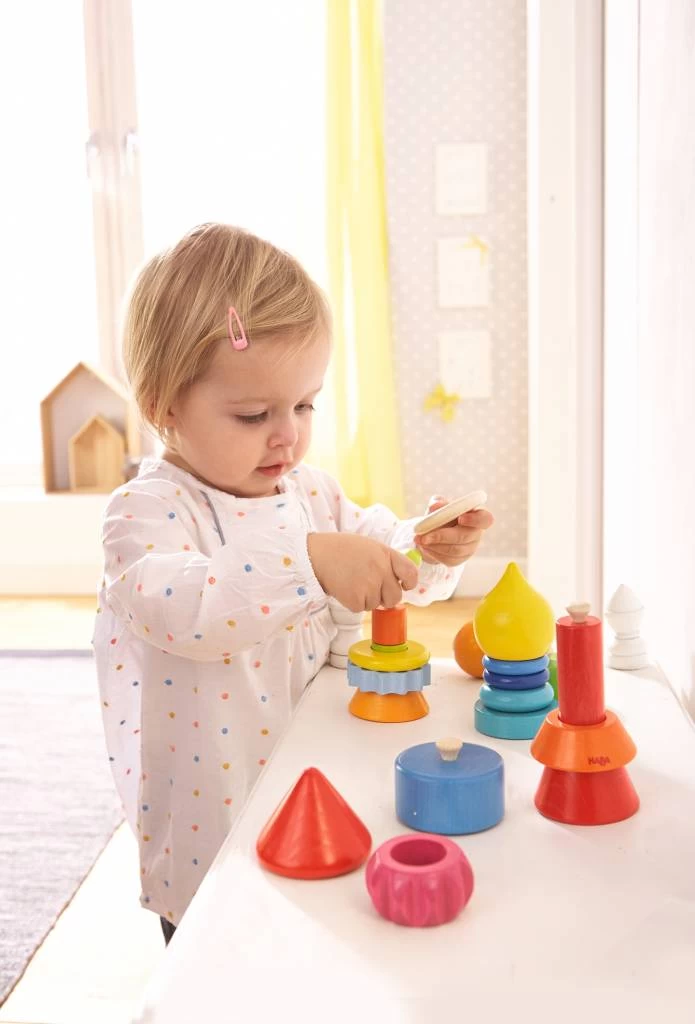Kleine bouwmeesters kunnen de kleurrijke houten stukken naar believen samenvoegen tot drie torens of er één heel hoge toren mee bouwen. Welke spits moet op de grote toren? Dat is altijd opnieuw heel leuk en bevordert de fijne motoriek.