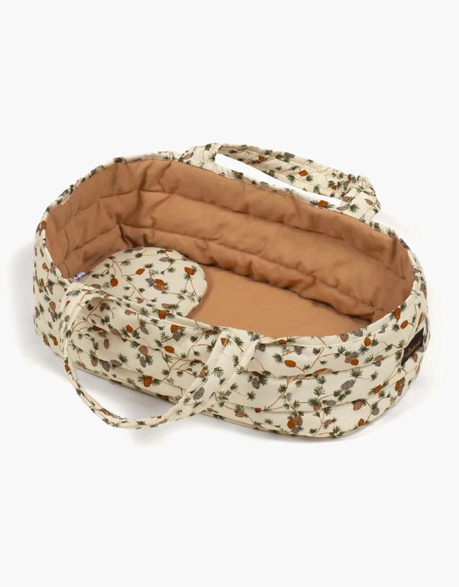 De wieg heeft een herfstig motiefje met dennenappels voor poppen van maximaal 34 cm zoals de Gordi poppen van Paola Reina.