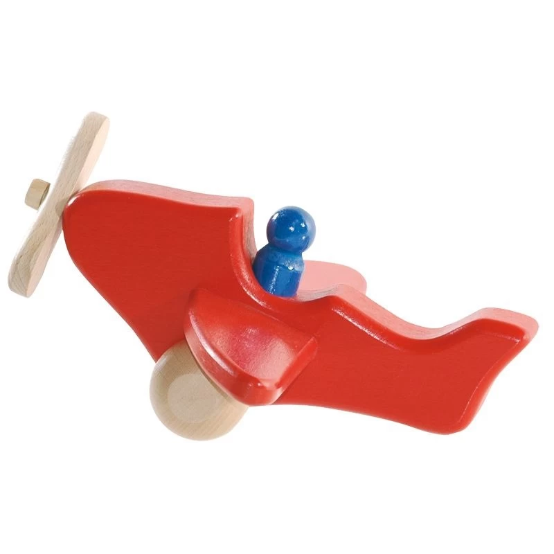 Vliegen we naar Afrika, Amerika of Londen? Alles kan en alles mag met dit mooie, duurzaam houten handgemaakte open rode vliegtuigje van Ostheimer. Het vliegtuigje wordt bestuurd door een blauwe houten piloot. De wieltjes kunnen rollen de propeller draait echt!