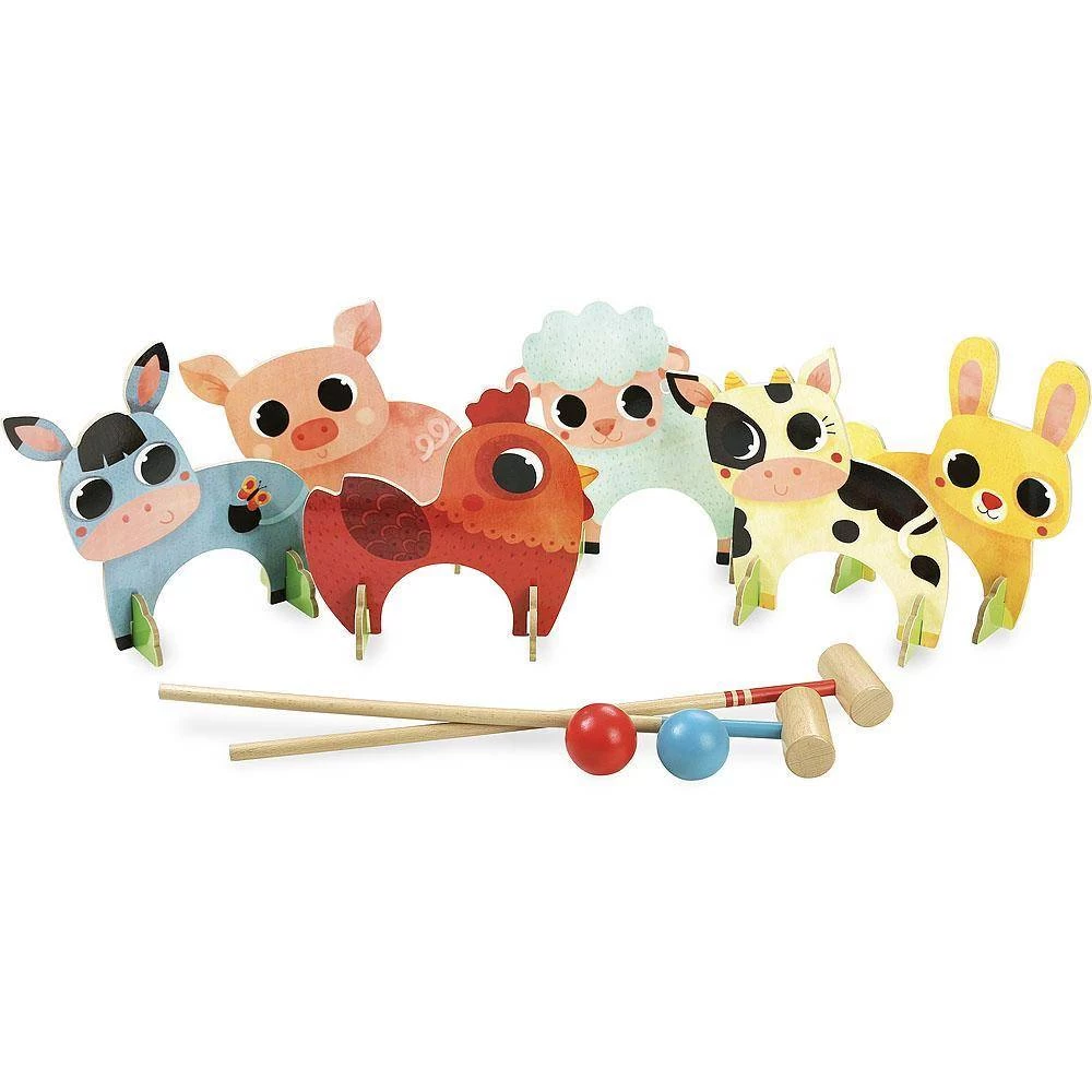 - Inhoud: 6 poortjes met vrolijke dierenprint, 2 houten hamers, 2 ballen (de poortjes zijn 23 cm hoog)